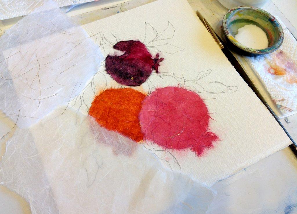 In the final stage I added additional collage leaves on the lowest pomegranate, cast shadows.